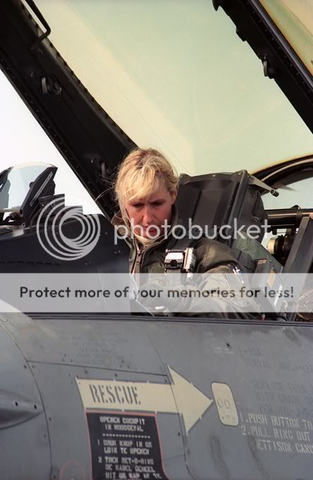 16. Przy tym zdjęciu zatrzymam się nieco dłużej. Fotka przedstawia kpt. Manję Blok, pierwszą Full Combat Ready pilotkę RNAF, w trakcie ćwiczenia wsławiła się tym, że poleciała raz a później grzała ławę. Natomiast jej życiorys lotniczy jako pilota F16 zdobi chwała jednej z nielicznych, jeśli nie jedynej akcji w Byłej Jugosławii, gdzie miała okazję zbombardować czołg bodajże 11 lipca 1995, co bardziej złośliwi twierdzą, że a jakże zbombardowała ale ogrodzenie prywatnej posesji na szczęście obyło się bez CD.