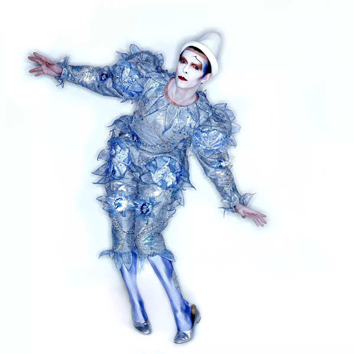 David Bowie in his Pierrot or Blue Clown costume from the music video for "Ashes to Ashes" (1980), as well as the album cover for Scary Monsters (and Super Creeps) (1980). Costume design by Natasha Korniloff.