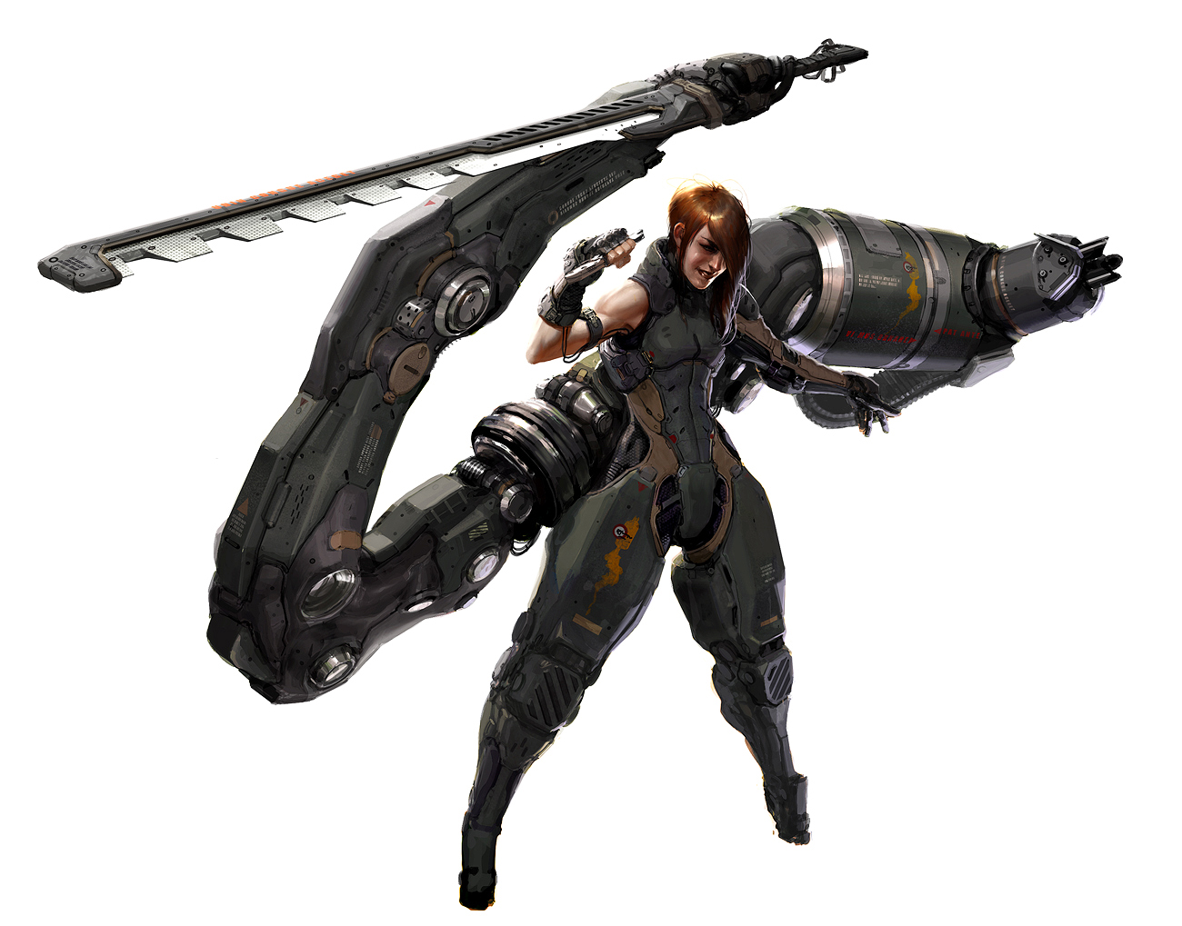 Mounted on the back of the suit is the real reason for it’s efficiency in combat. A robotic arm that can wield a multitude of weapons and mimics every move of the suit's right arm. This suit is armed with an Anti-Armor-Vibro-Sword that can cut through steel, stone and armed concrete like it’s made of paper.