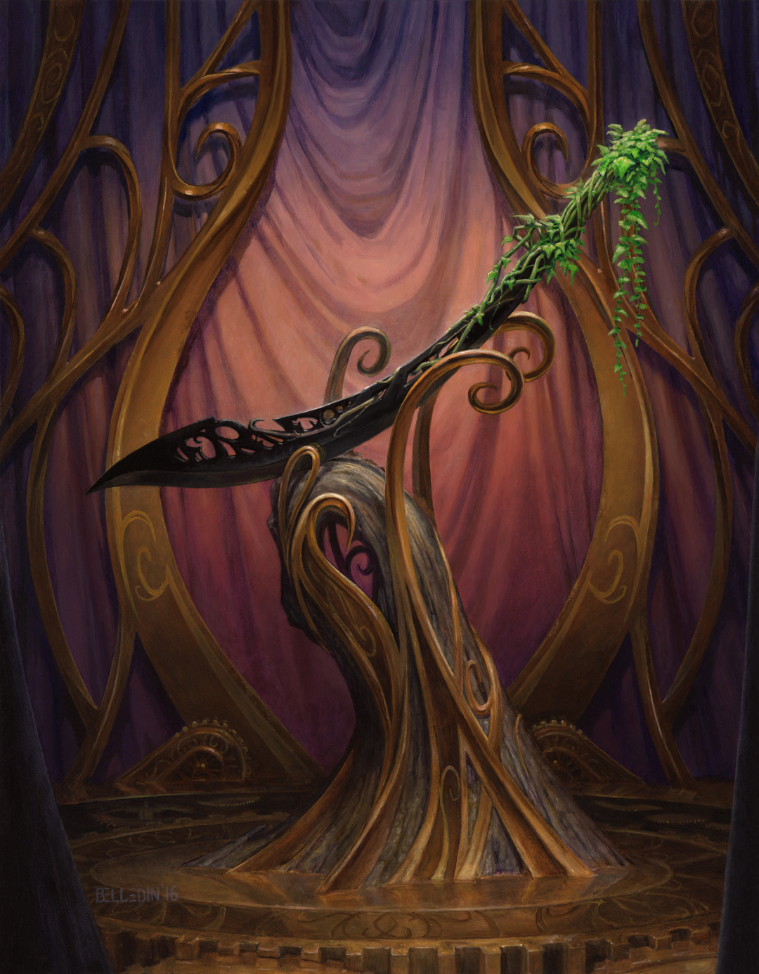 This is my favorite artwork of the Sword series from Magic the Gathering. The unique design within the sword compliments the lush plant design within the hilt. The guard of the sword is made of a series of plants.