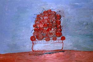 This image is actually a revisiting of a painting I did back in 2004/2005, I suppose you could call it a refresher. The color's way better in this one, and while the space the cherries sit in in deeper, it could stand some more push. Next time!