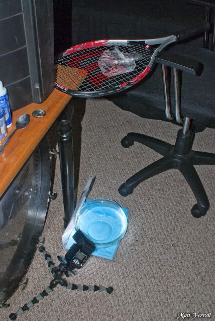 To get it over the bowl of water, I balanced a tennis racket between a table and chair,