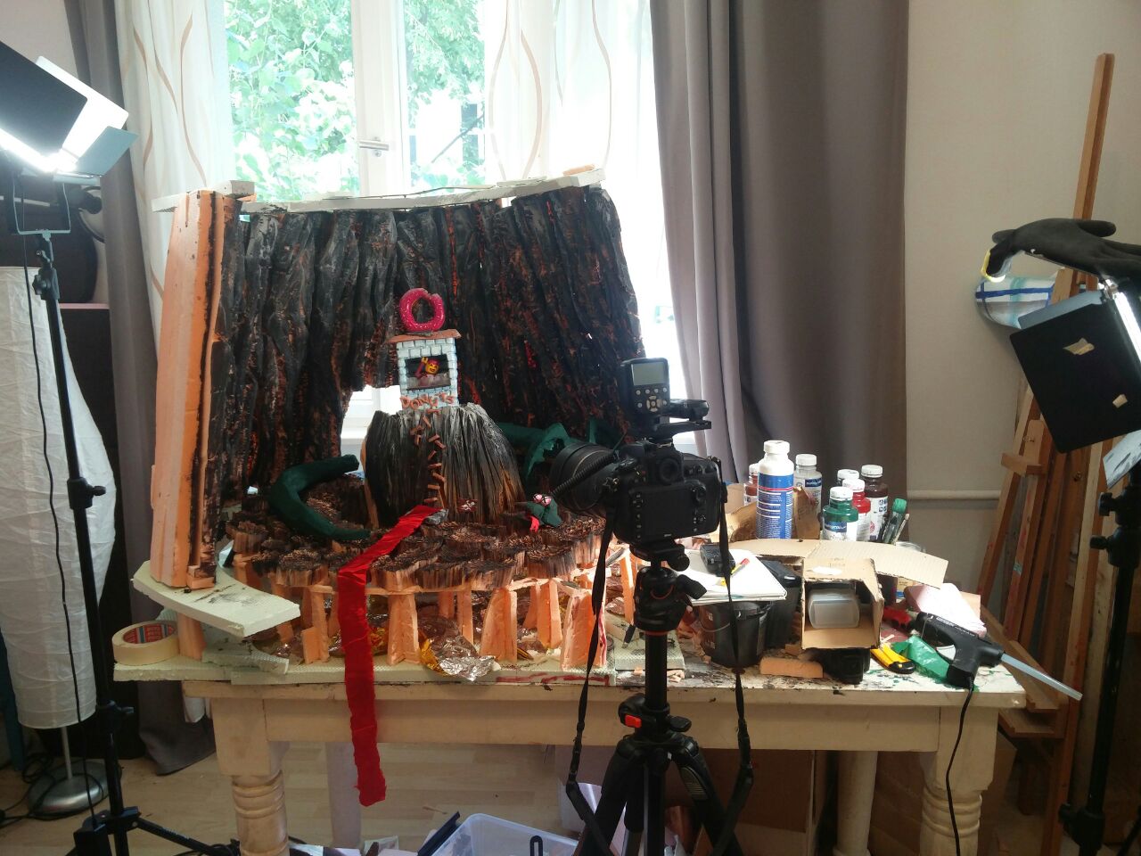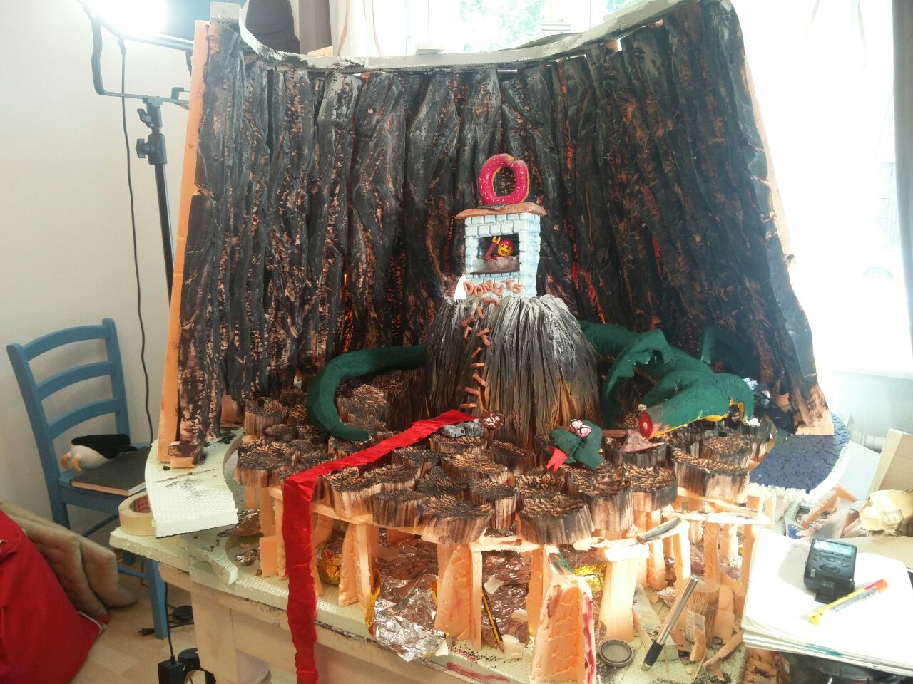 This looks like a 3D render but it's not, it's a picture of a small set entirely built by myself, on a table. It's mainly made of styrofoam saved from the trash, paint, hot glue, a small piece of transparent plastic from a packaging, some cardboard, and a piece of fabric.