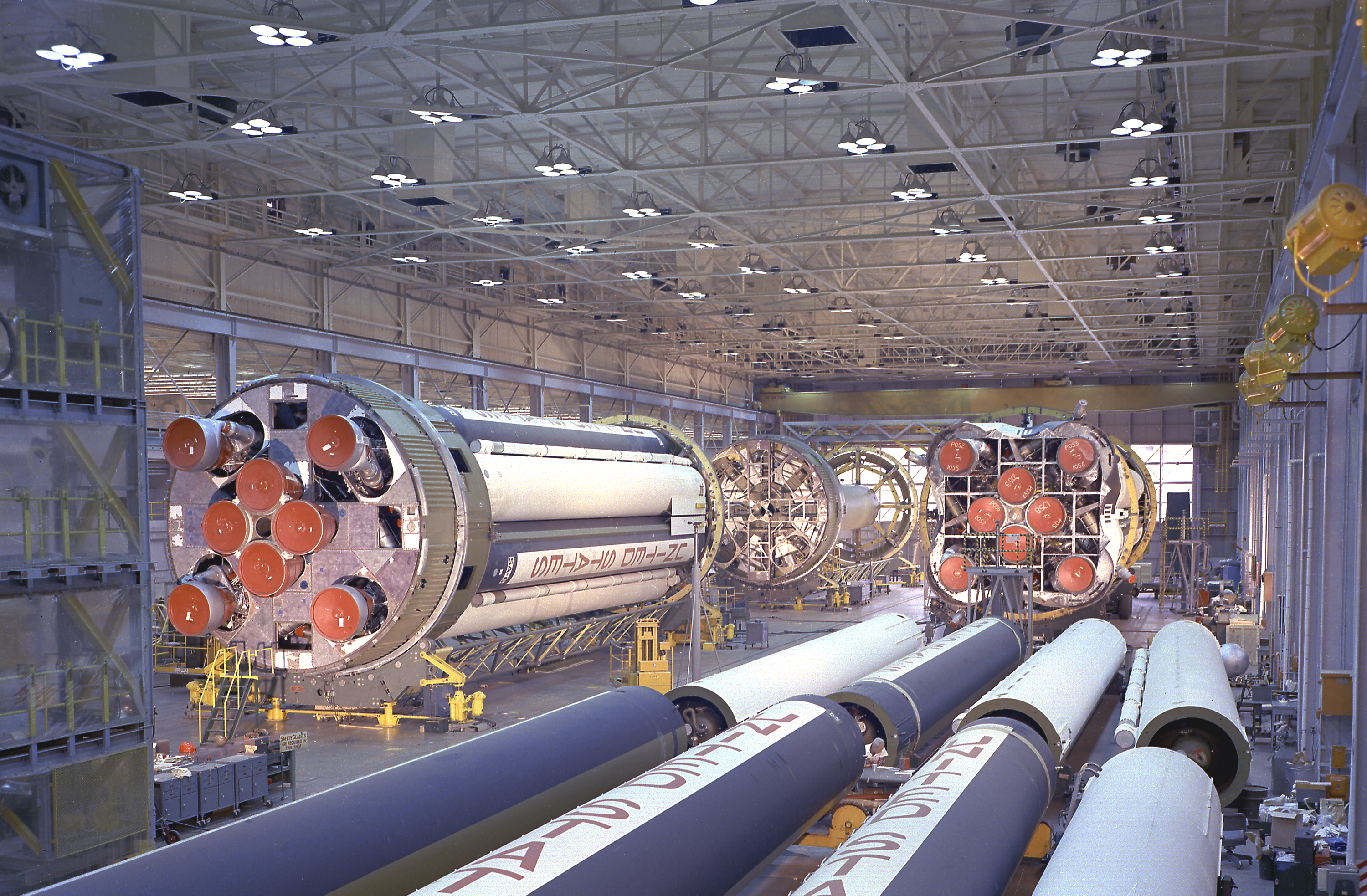 Another Unicorn: A SPECTACULAR view of the main assembly building (bldg 4705) at the Marshall Space Flight Center, Huntsville, Alabama shows three Saturn I boosters in various stages of assembly. At right, background, is the SA-4 booster which is now (24 March 1963) on the launch pedestal at Cape Canaveral. In the center background, the SA-7 booster build-up has begun. The tanks in the foreground are for the SA-7. At left is the SA-6 booster.