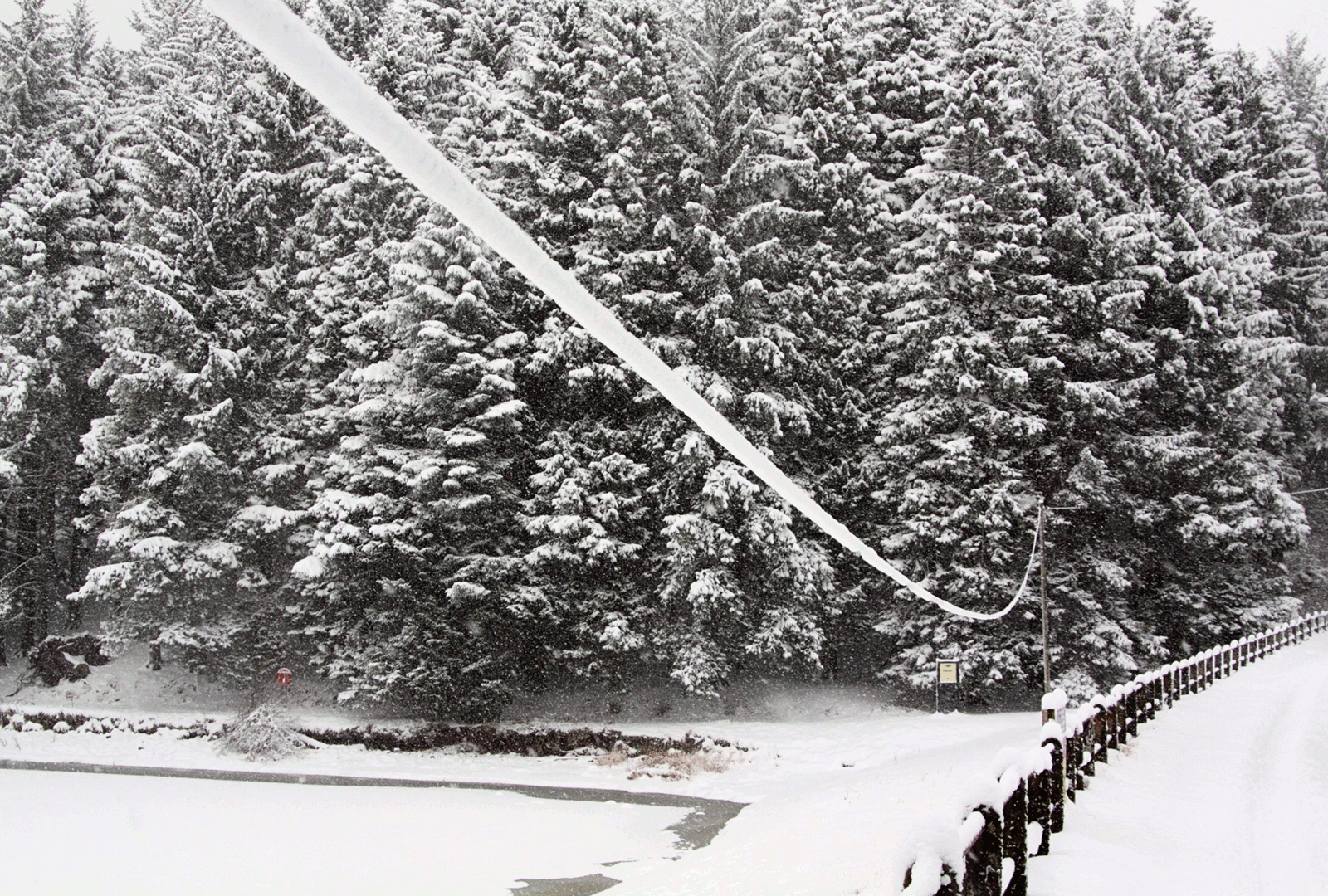 The same telephone cable after some snow was encouraged to fall off.
