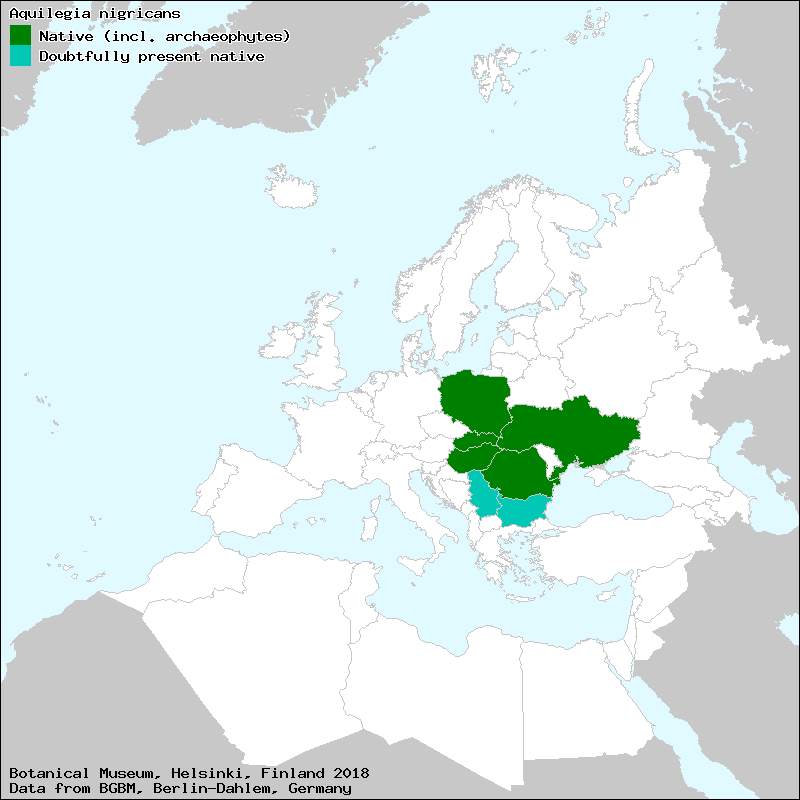 Aquilegia nigricans cf. Baumg., syn: Aquilegia haenkeana Koch, Aquilegia ullepitschii Pax, Aquilegia vulgaris subsp. nigricans (Baumg.) Domin, Aquilegia vulgaris var. nigricans (Baumg.) Schur