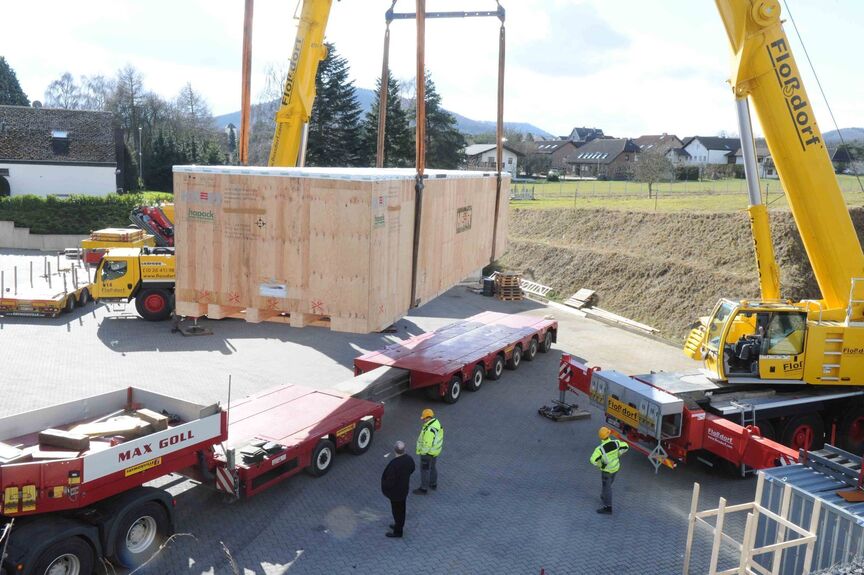 MAN Tgx von Universal Transporte aus Paderborn mit Broshuis 3achs Tele Auflieger und einem ĂĽber 60 Meter langem FlĂĽgelblatt fĂĽr eine Repower Windkraftanlage