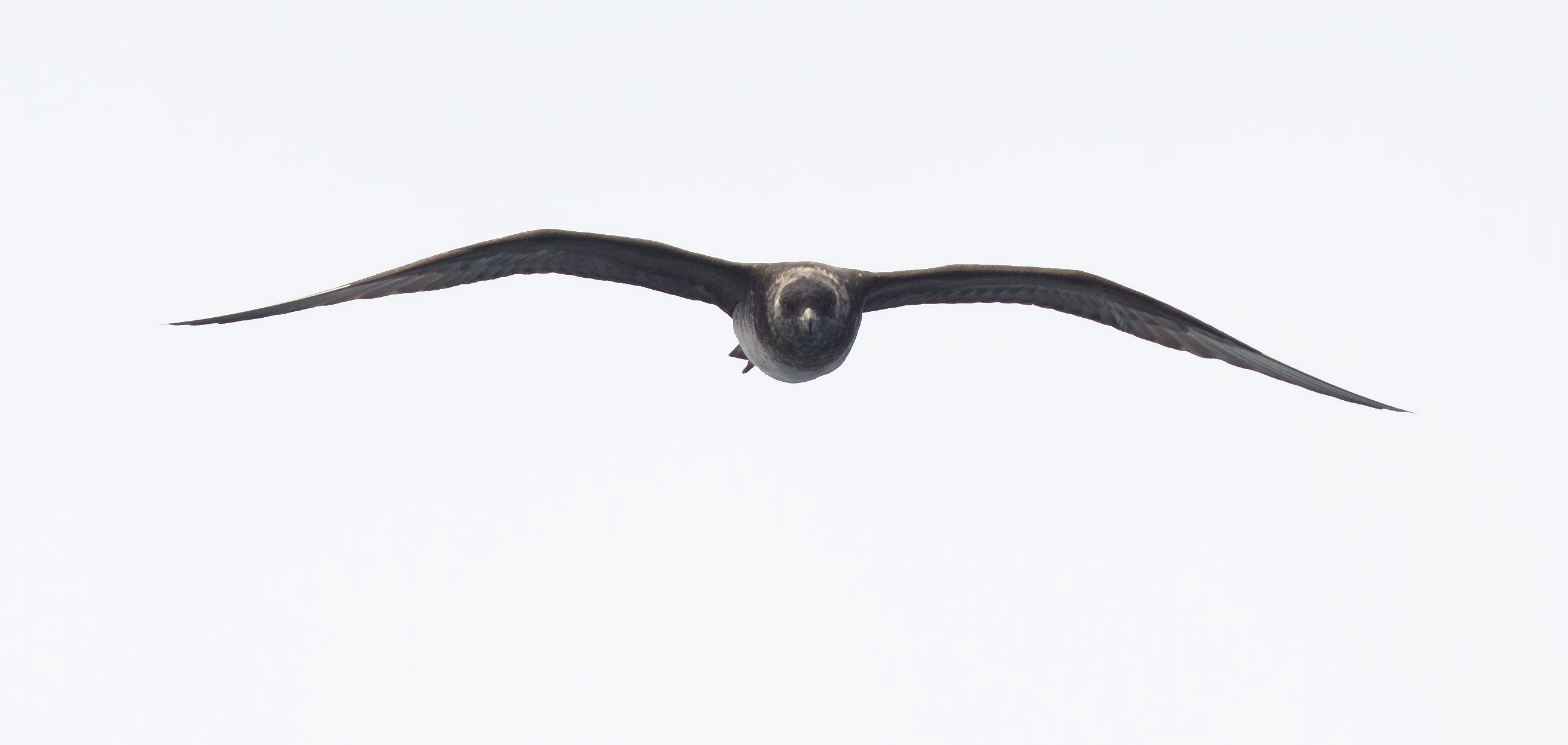 Lots of white primary shafts, big bill, and, I believe, full spoonage on the tail feathers as they said on the boat. Much better photo of a Pomarine Jaeger taken on the same trip by Pete Sole here: www.lighthousenet.com/photos/birds/web_ready/gulls_terns/jaeger_pomarine_140913a.jpg