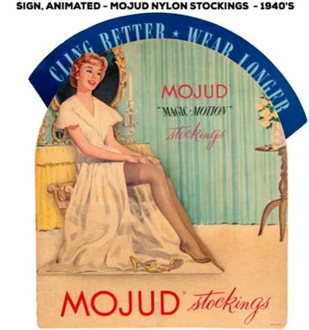 16x17.75" animated cardboard display that advertises Mojud's "Magic Motion" stockings. 1940s. Center of display has image of leggy blonde w/her stocking-clad legs exposed. One of them is separate die-cut cardboard piece that moves up/down when display is plugged in. Top of display has die-cut "Mojud" letters set against moving backdrop that reads "Cling Better - Wear Longer."