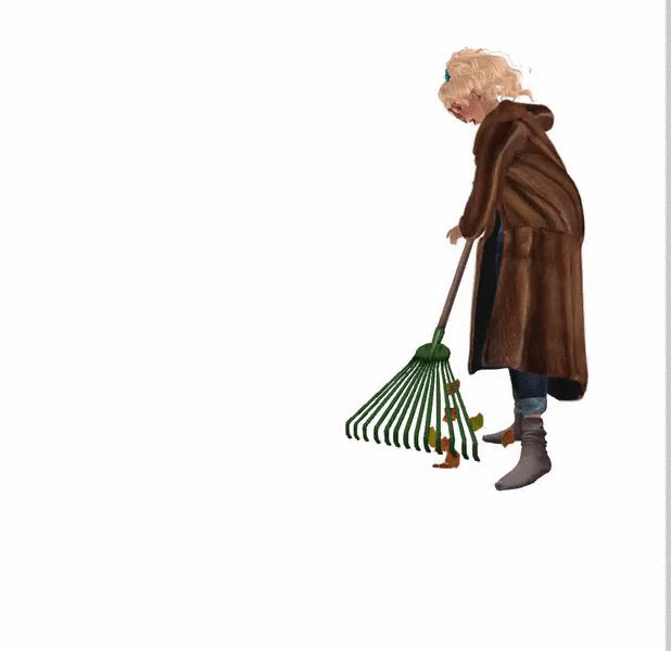 Animated rake with particles, a leaf pile and a leafy mess.
